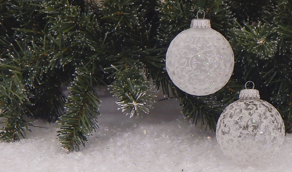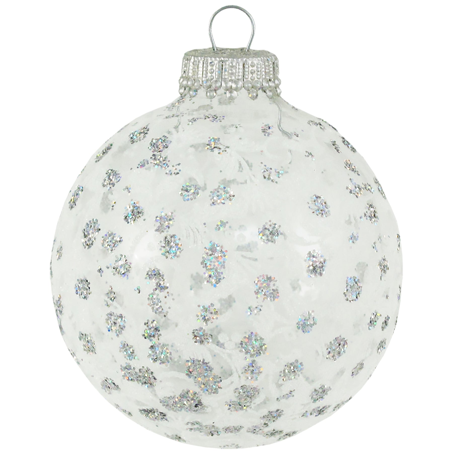 Clear / Frost 2 5/8" Glass Balls with White Lace and Silver Sparkles (Silver Crown Caps). 2 Styles per Assortment. 4 Pieces per Box. 12 Boxes per Case. Made in USA.