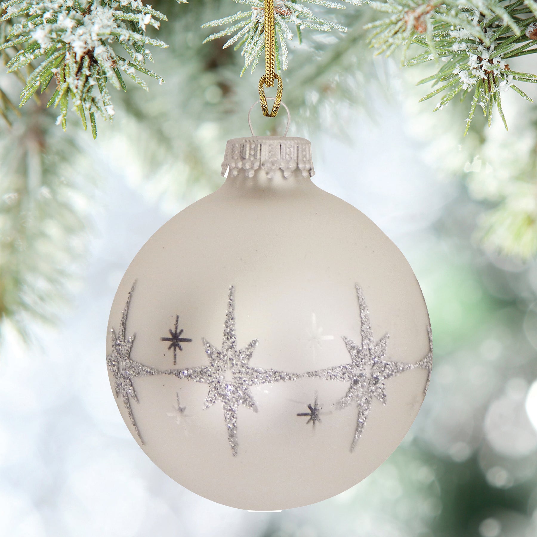 Silver Pearl 2 5/8" Glass Balls with Lacquer / Silver Glitter Bethlehem Stars. 4 Pieces per Box. 12 Boxes per Case. Made in USA.