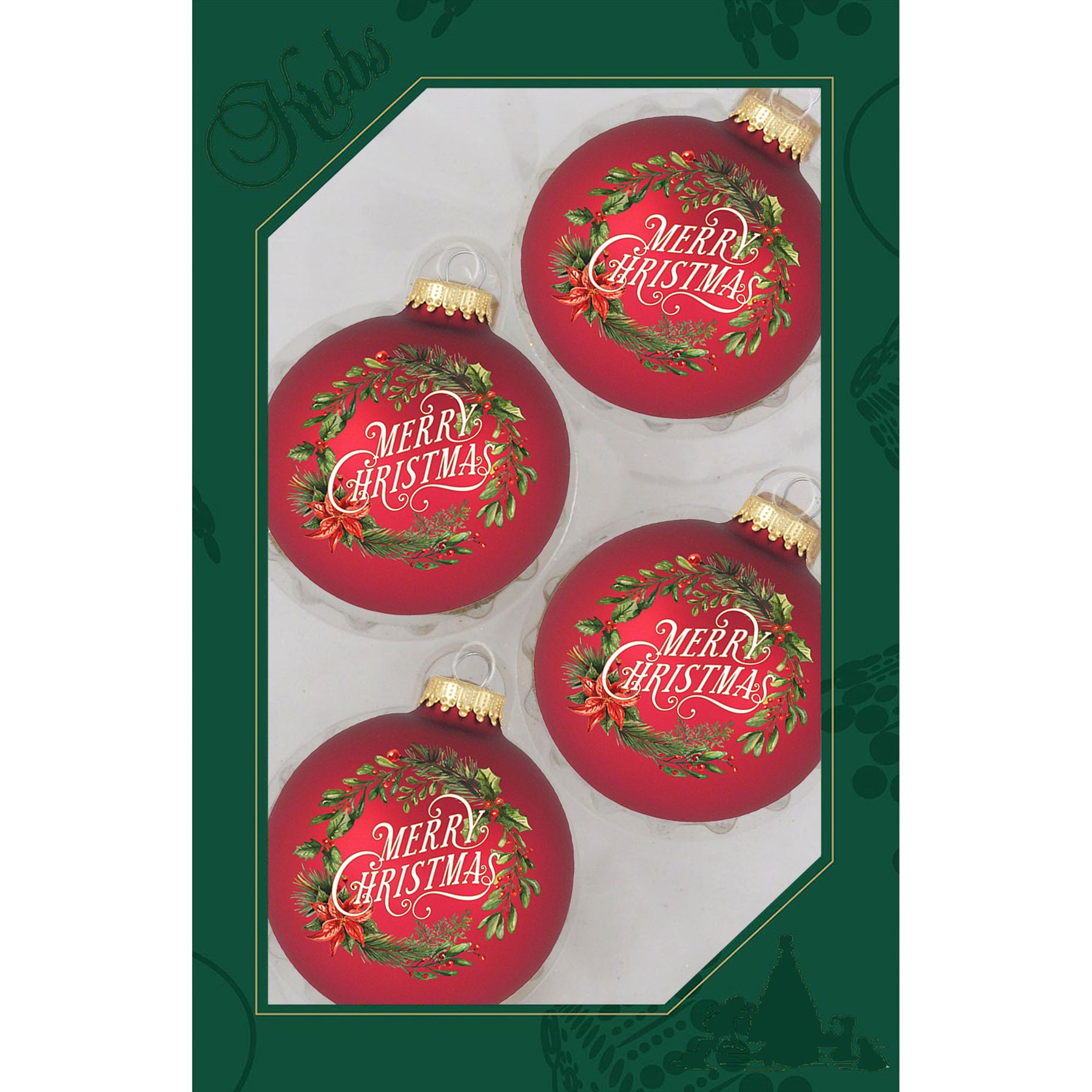 2 5/8" Red Velvet Glass Ball with Merry Christmas Wreath. 4 Pieces per Box. 12 Boxes per Case. Made in USA.