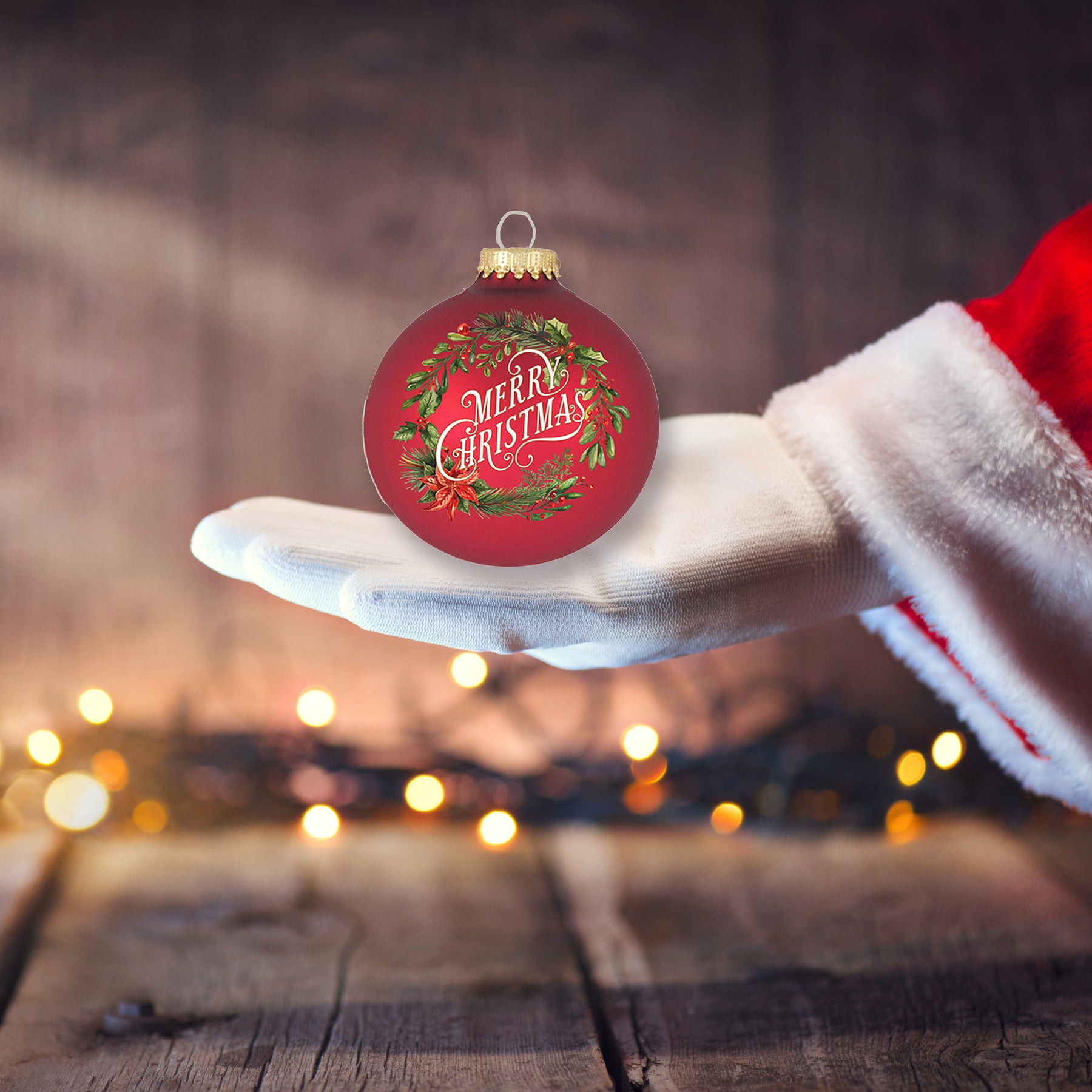 2 5/8" (67mm) Glass Ball Ornaments, Red Velvet with Merry Christmas Wreath, 4/Box, 12/Case, 48 Pieces
