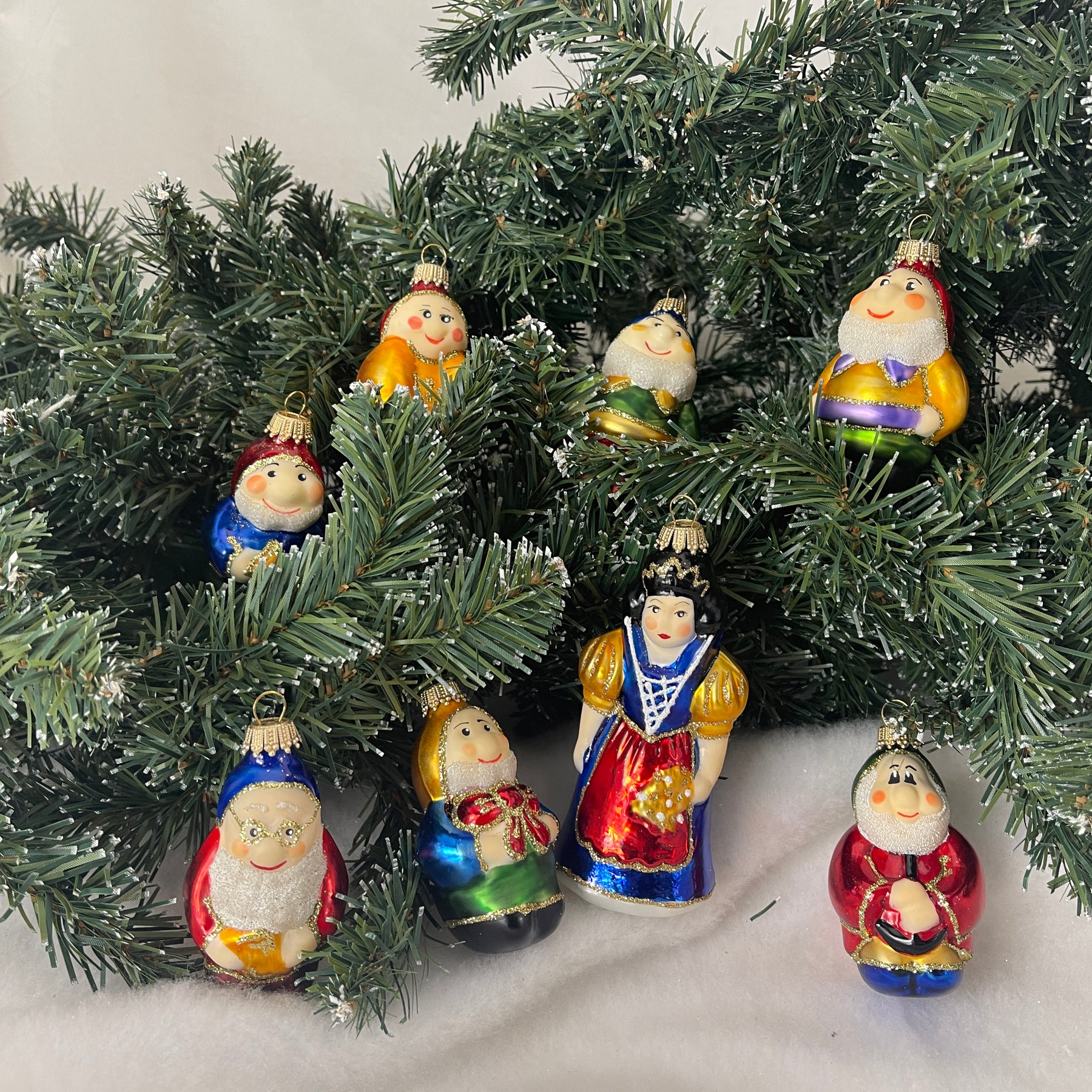 Fairytale Snow White & 7 dwarfs Multicolor set, 3 inches & 4.25 inches Ornament. Bulk Packed with Hang Tag. 32 Pieces per Case. Made in Ukraine