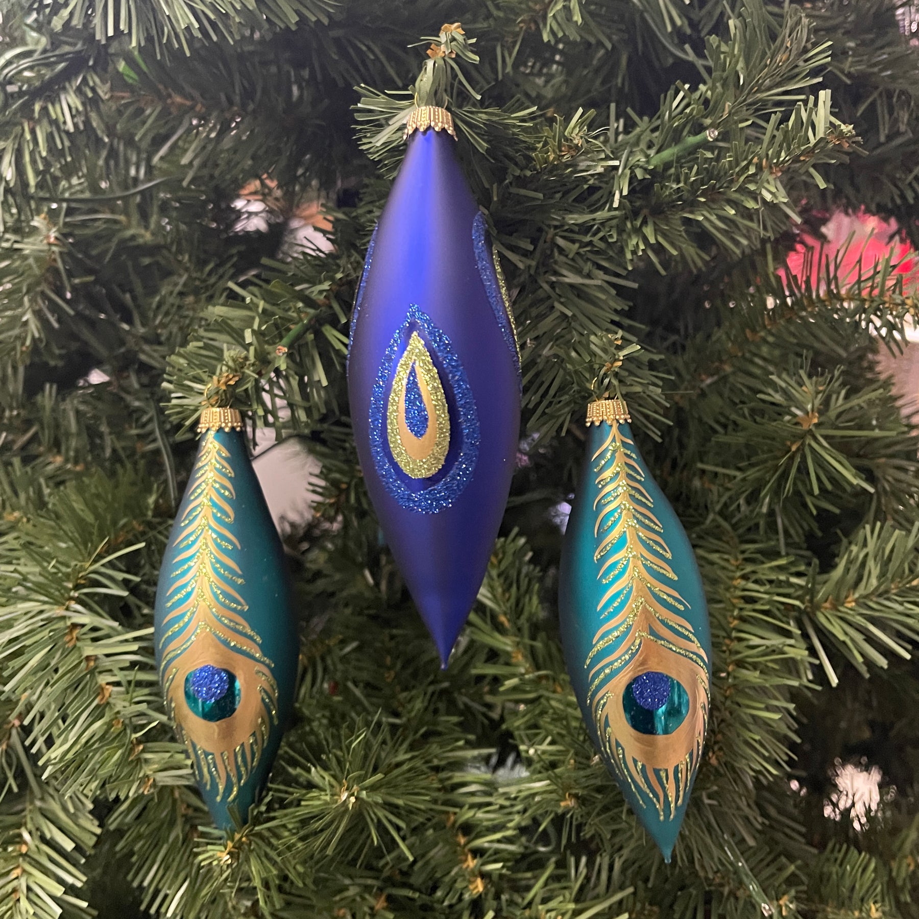 Christmas Peacock Glass Finial, set of 3, Matte Blue, 5.6 inches (15cm) Ornament. Bulk Packed with Hang Tag. 24 Pieces per Case. Made in Ukraine