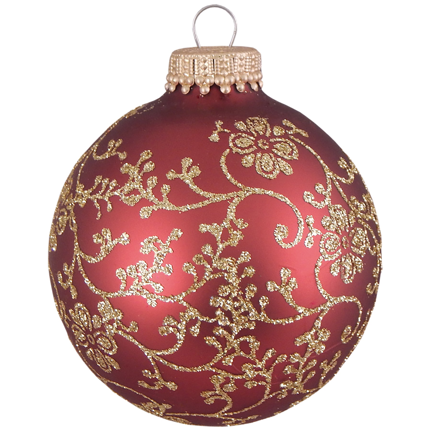 2 5/8" Variety Set Red Glitterlace Glass Balls with Gold Sparkle and December Red. 12 Pieces per Box. 12 Boxes per Case. Made in North America.