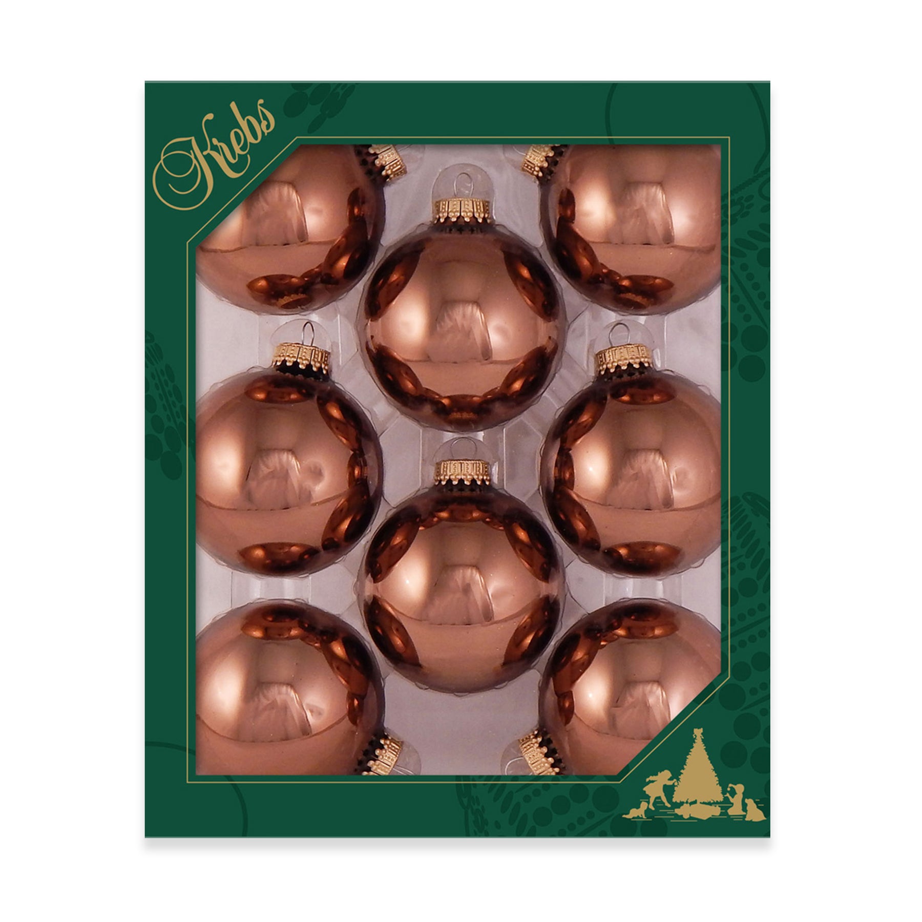 Acacia Brown Shine 2 5/8" Glass Balls with Gold Crown Caps. 8 Pieces per Box. 12 Boxes per Case. Made in North America.