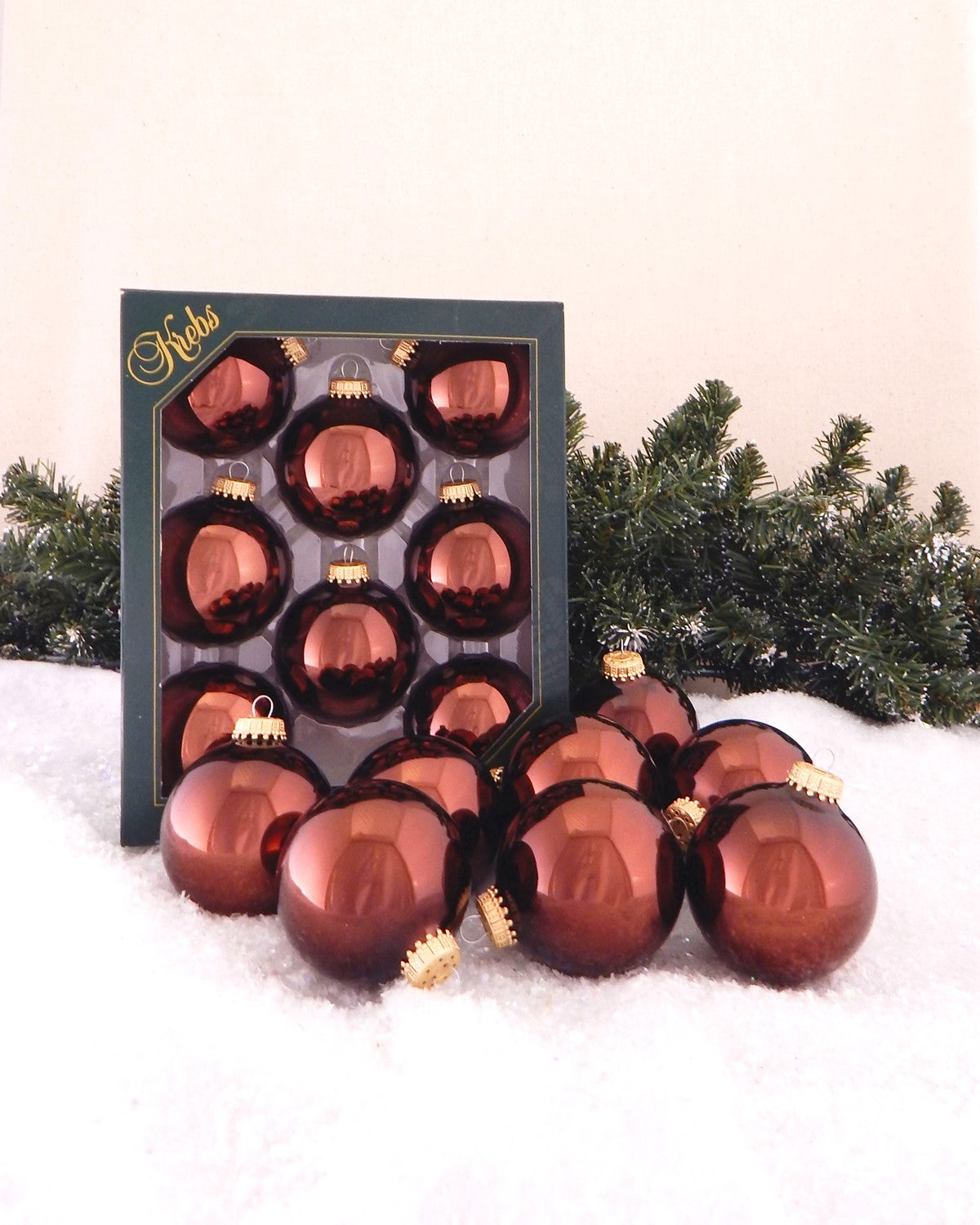 Friar Brown Shine 2 5/8" Glass Balls with Gold Crown Caps. 8 Pieces per Box. 12 Boxes per Case. Made in North America.