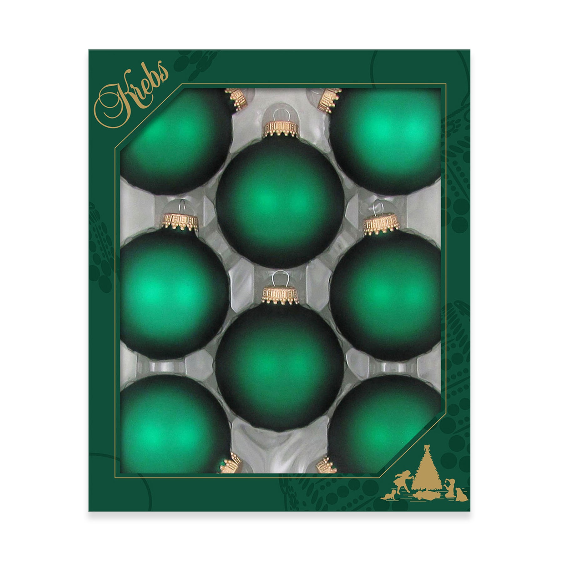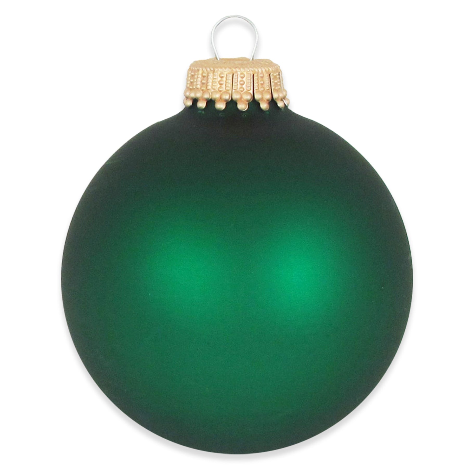 Green Velvet 2 5/8" Glass Balls with Gold Crown Caps. 8 Pieces per Box. 12 Boxes per Case. Made in North America.