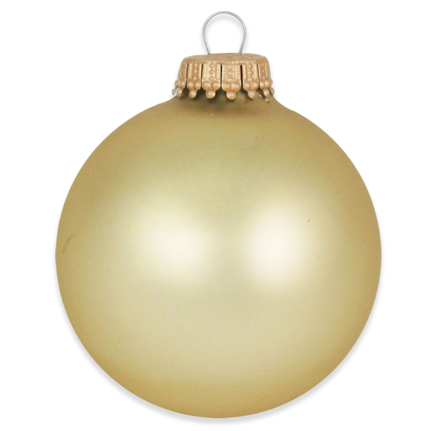 Harvest Gold 2 5/8" Glass Balls with Gold Crown Caps. 8 Pieces per Box. 12 Boxes per Case. Made in North America.