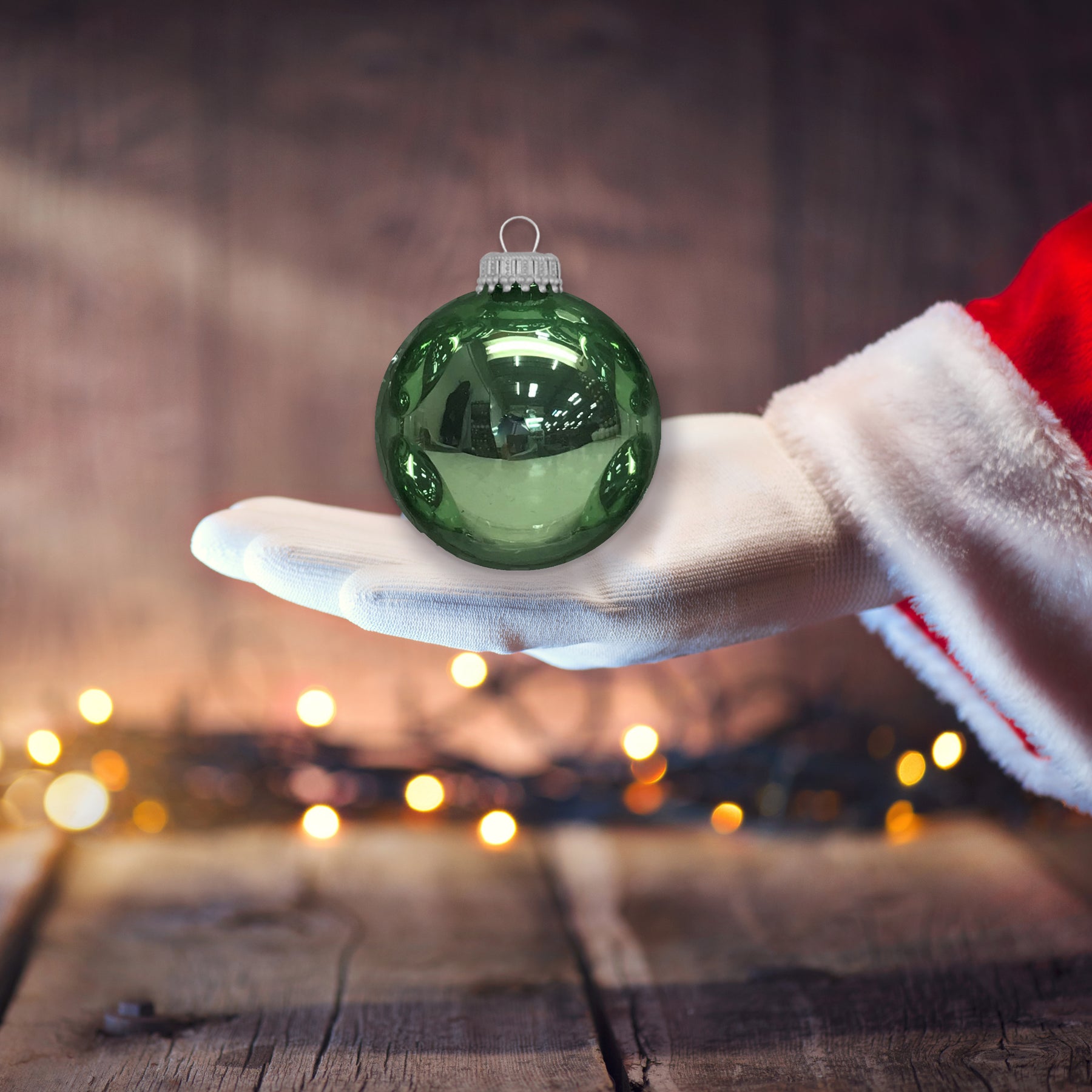 Eucalyptus Shine 2 5/8" Glass Balls with Silver Crown Caps. 8 Pieces per Box. 12 Boxes per Case. Made in North America.