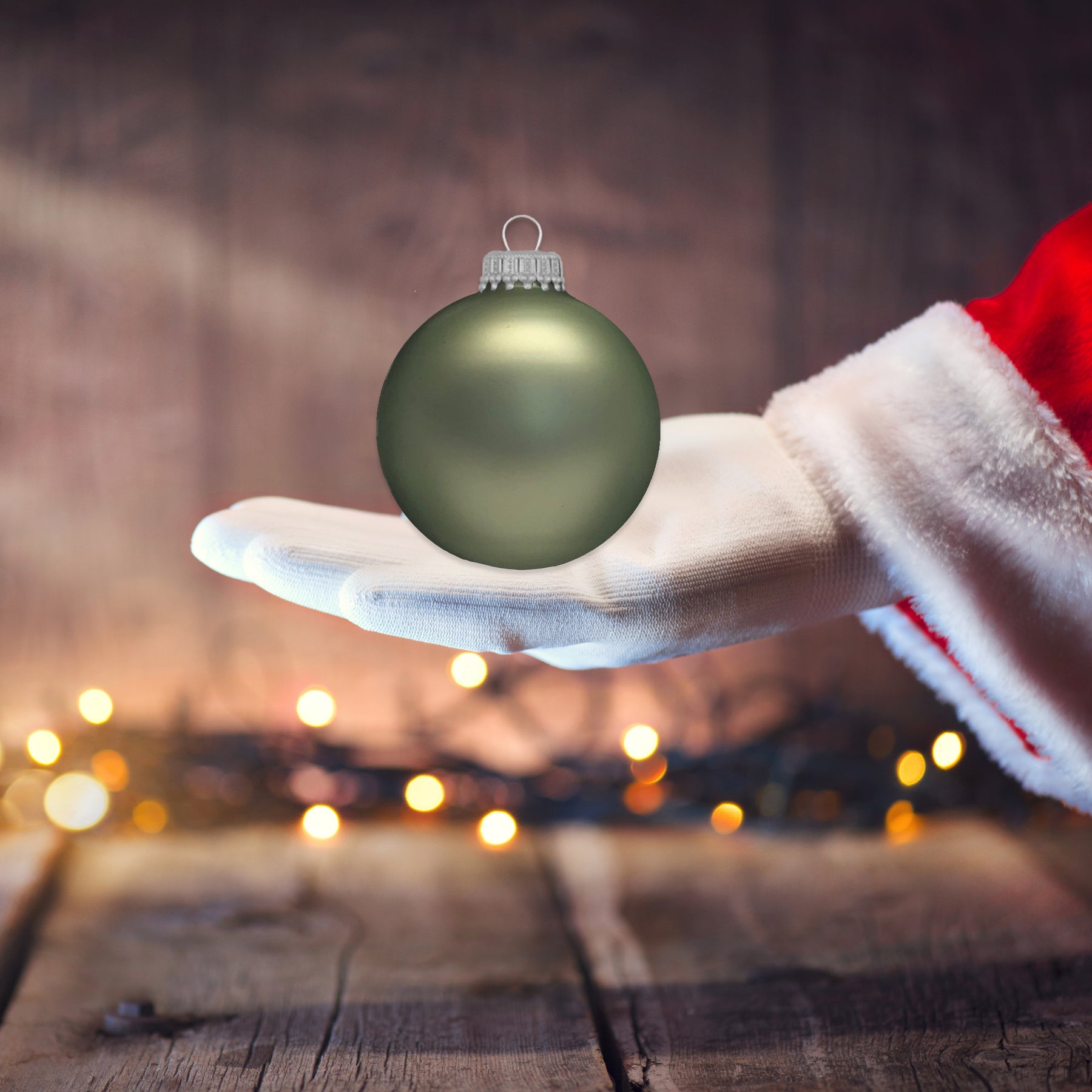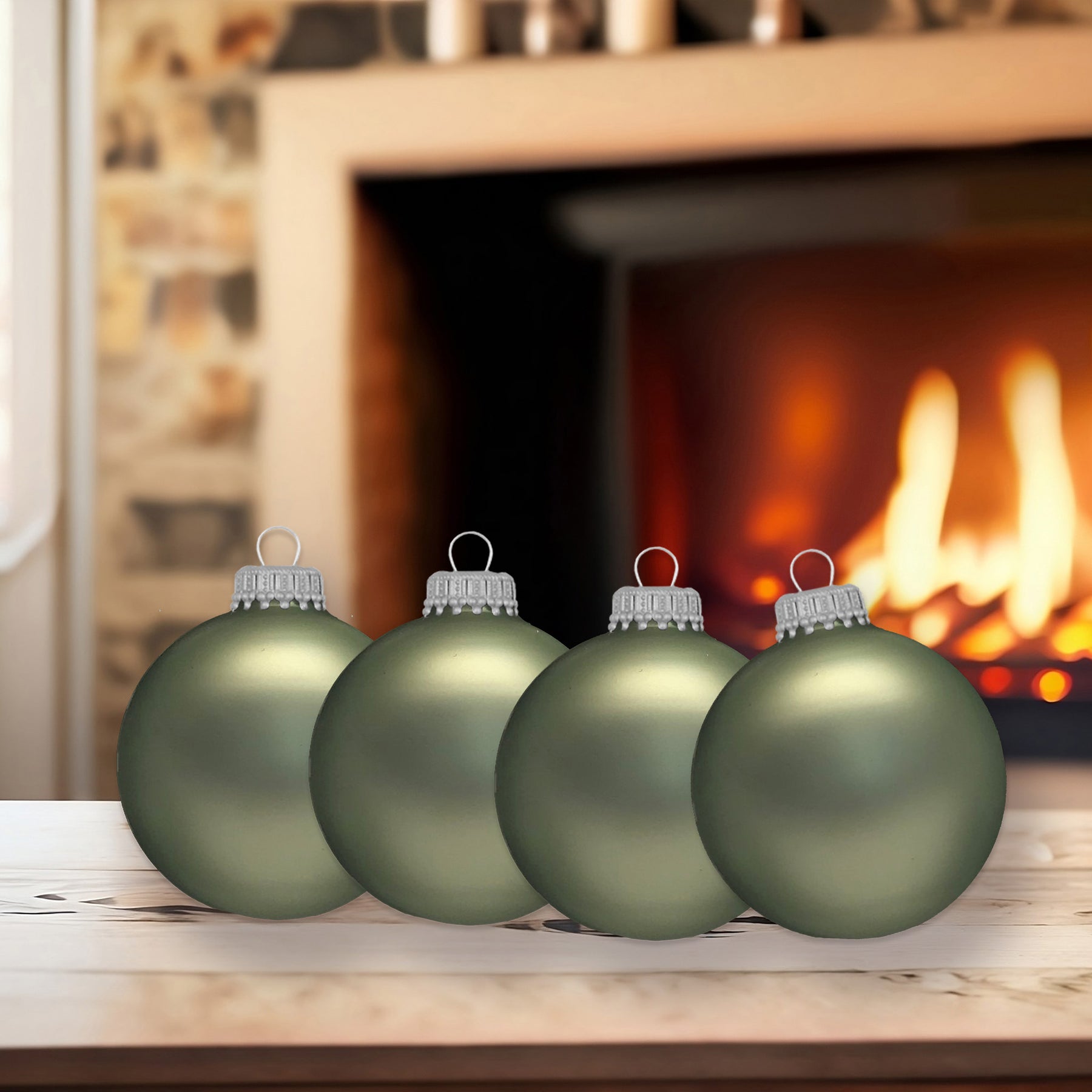 Sage Velvet 2 5/8" Glass Balls with Silver Crown Caps. 8 Pieces per Box. 12 Boxes per Case. Made in North America.