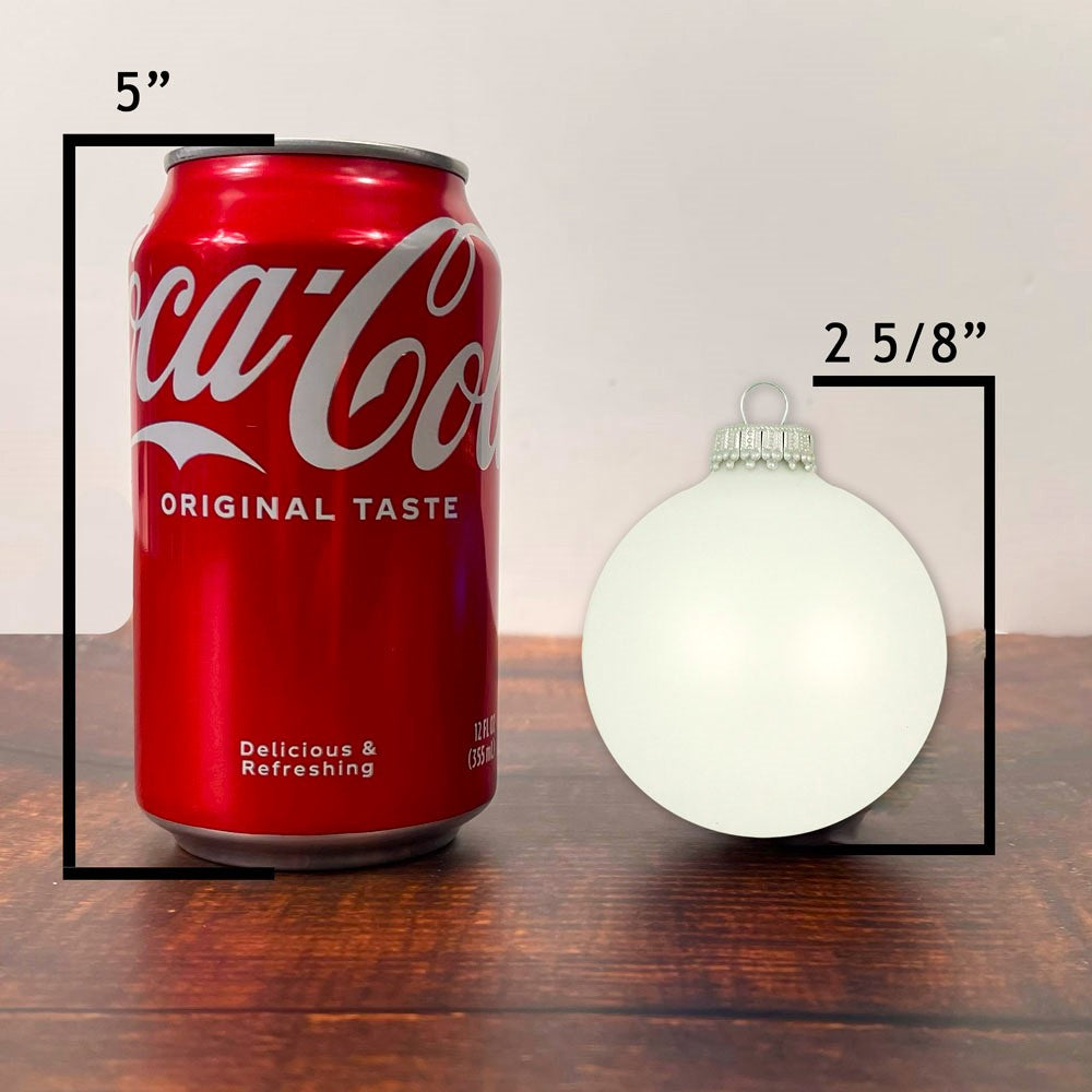 Snow White 2 5/8" Glass Balls with Silver Crown Caps. 8 Pieces per Box. 12 Boxes per Case. Made in North America.