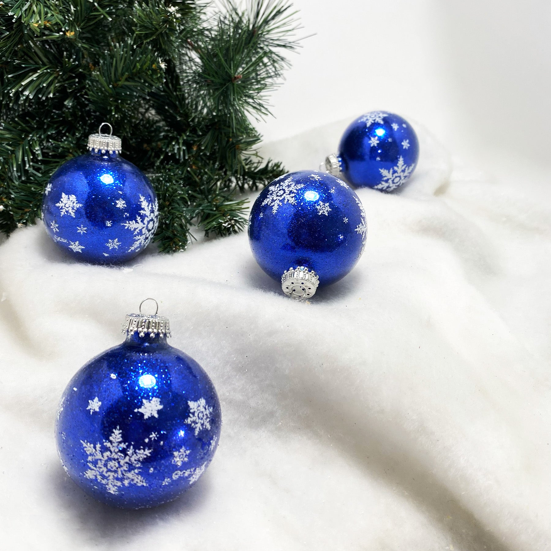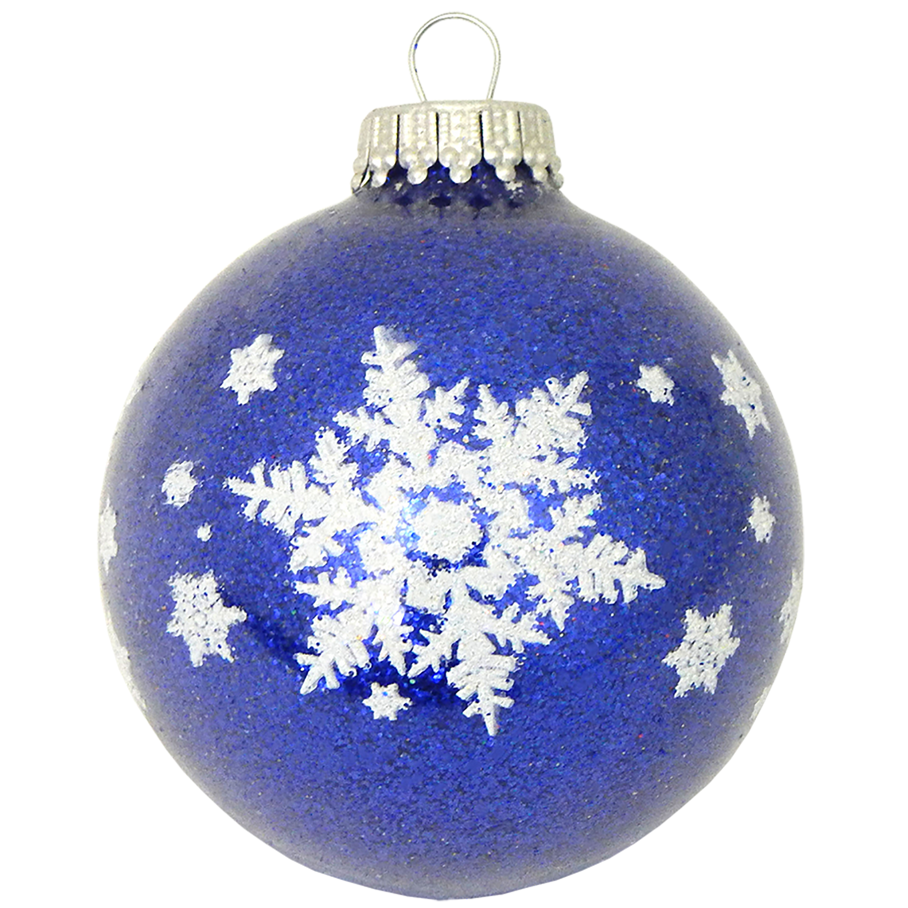 2 5/8"?Dark Blue Sparkle?Glass Ball with White Big Snowflakes. 4 Pieces per Box12 Boxes per Case. Made in USA.