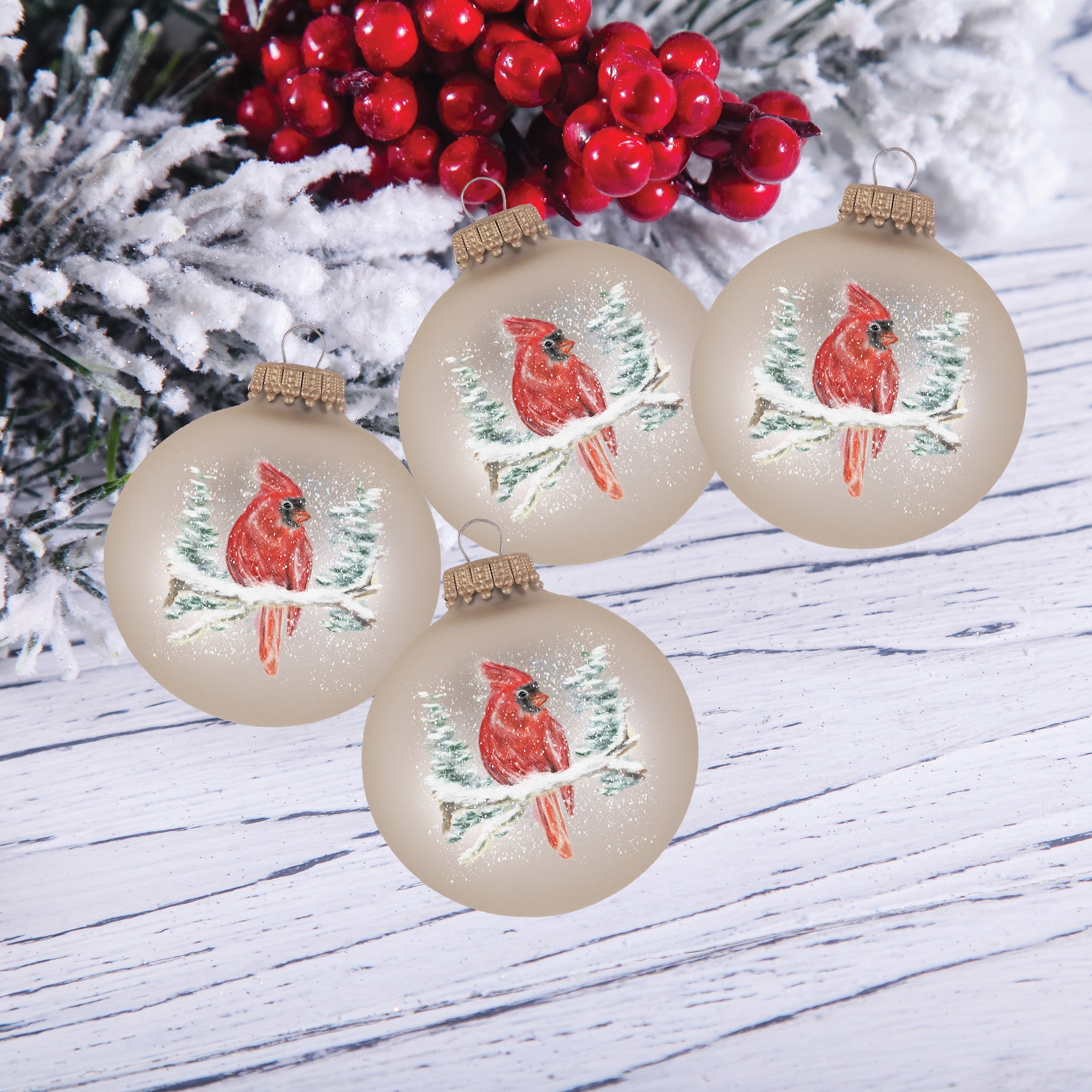 2 5/8"?Oyster Velvet?Glass Ball with Watercolor Cardinal. 4 Pieces per Box12 Boxes per Case. Made in USA.