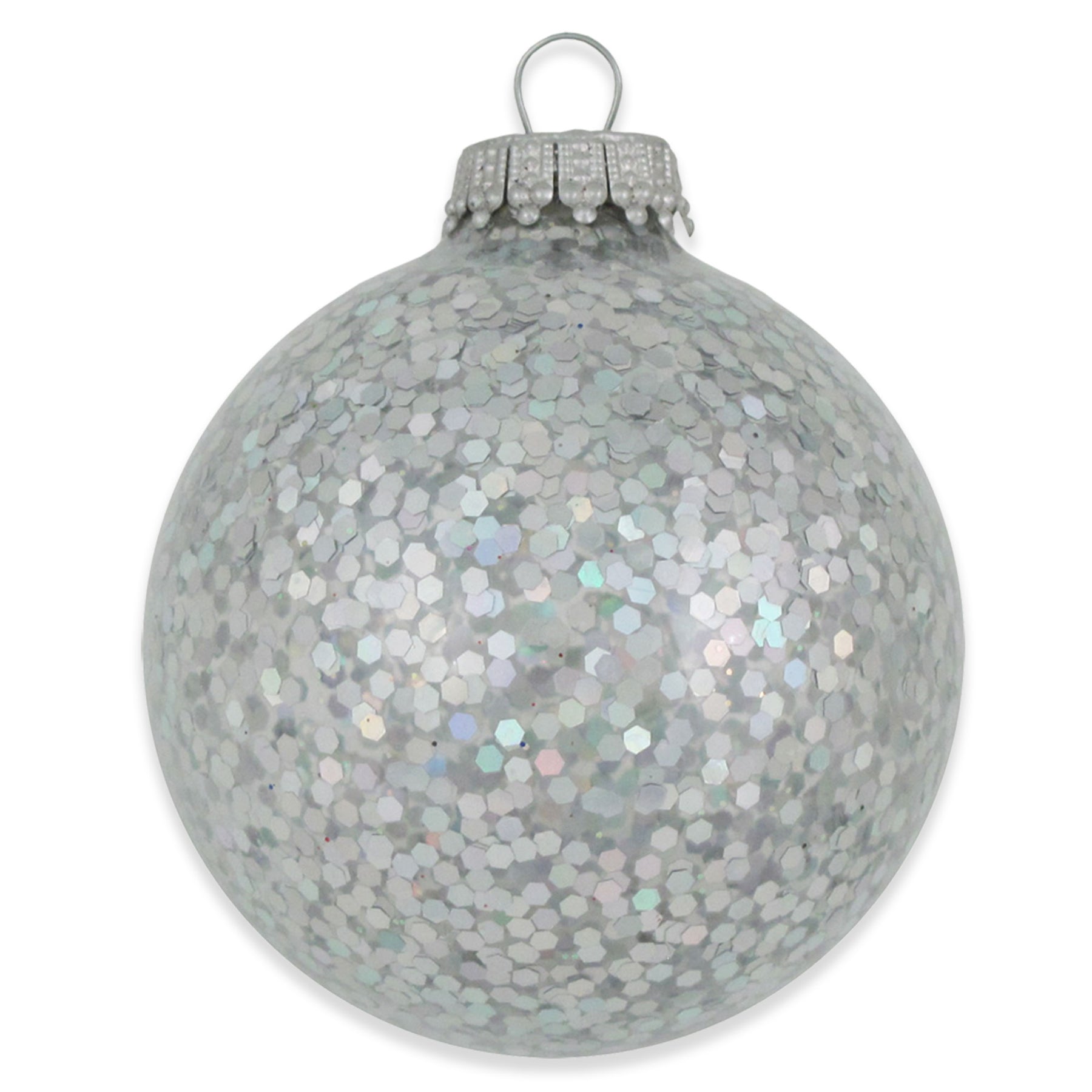 2 5/8"?Silver Spangle?Glass Ball. 6 Pieces per Box12 Boxes per Case. Made in USA.