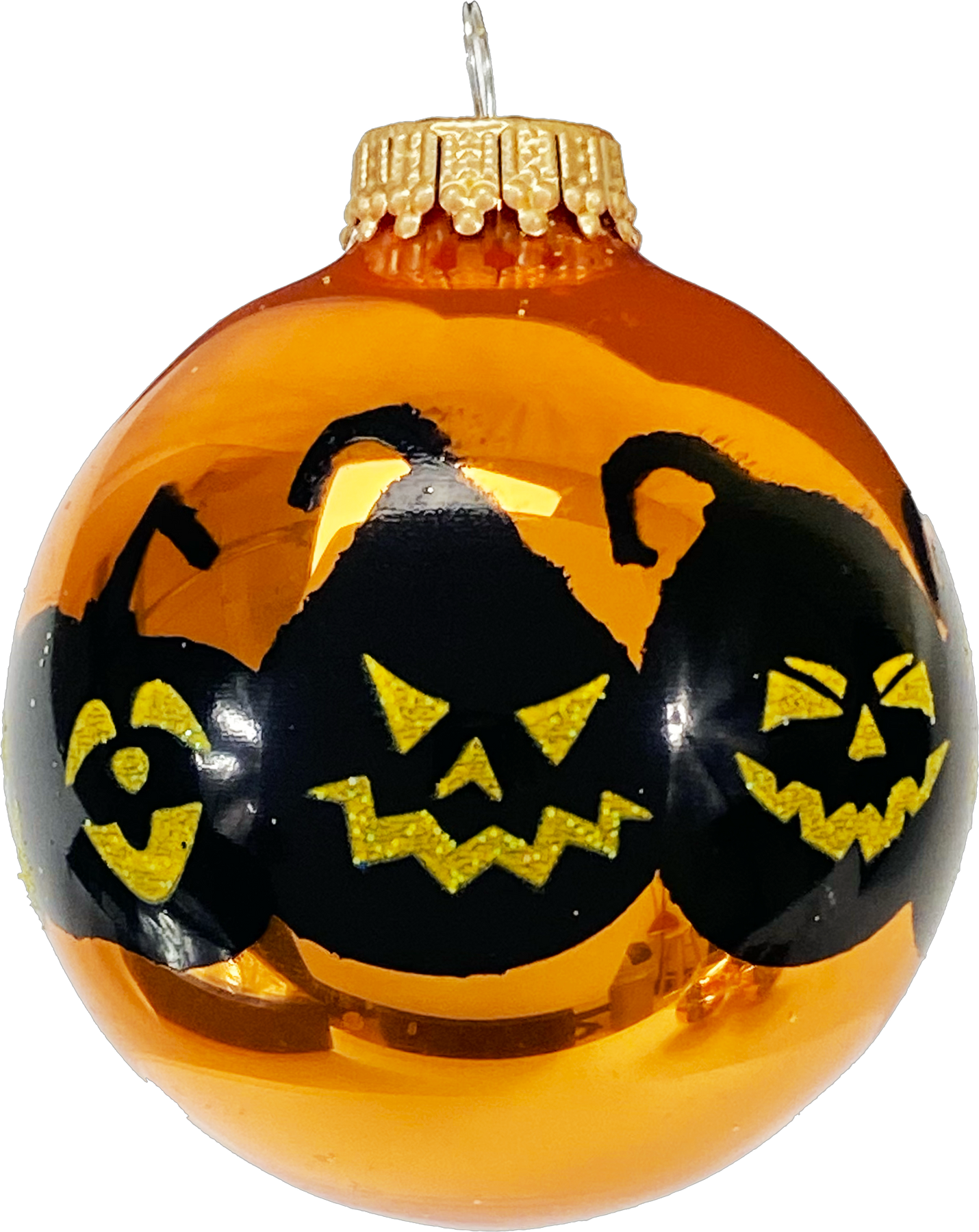 2 5/8" (67mm) Halloween Ball Ornaments Solid Orange Crush with Jack-O-Lanterns. 4 Pieces per Box. 12 Boxes Per Case. Made in USA.
