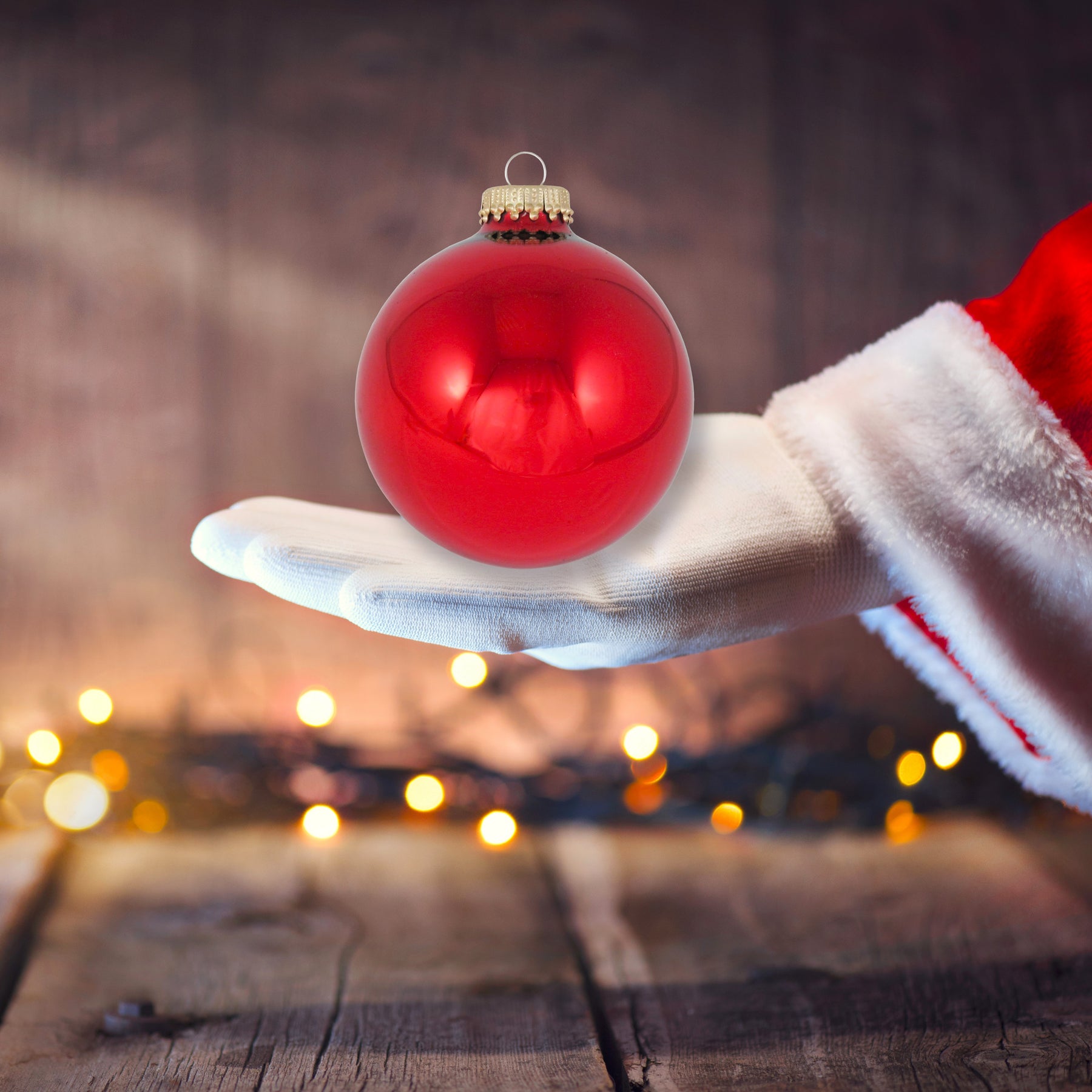 Christmas Red 3 1/4" Glass Ball Ornament. 4 Pieces per Box. 12 Boxes per Case. Made in USA.