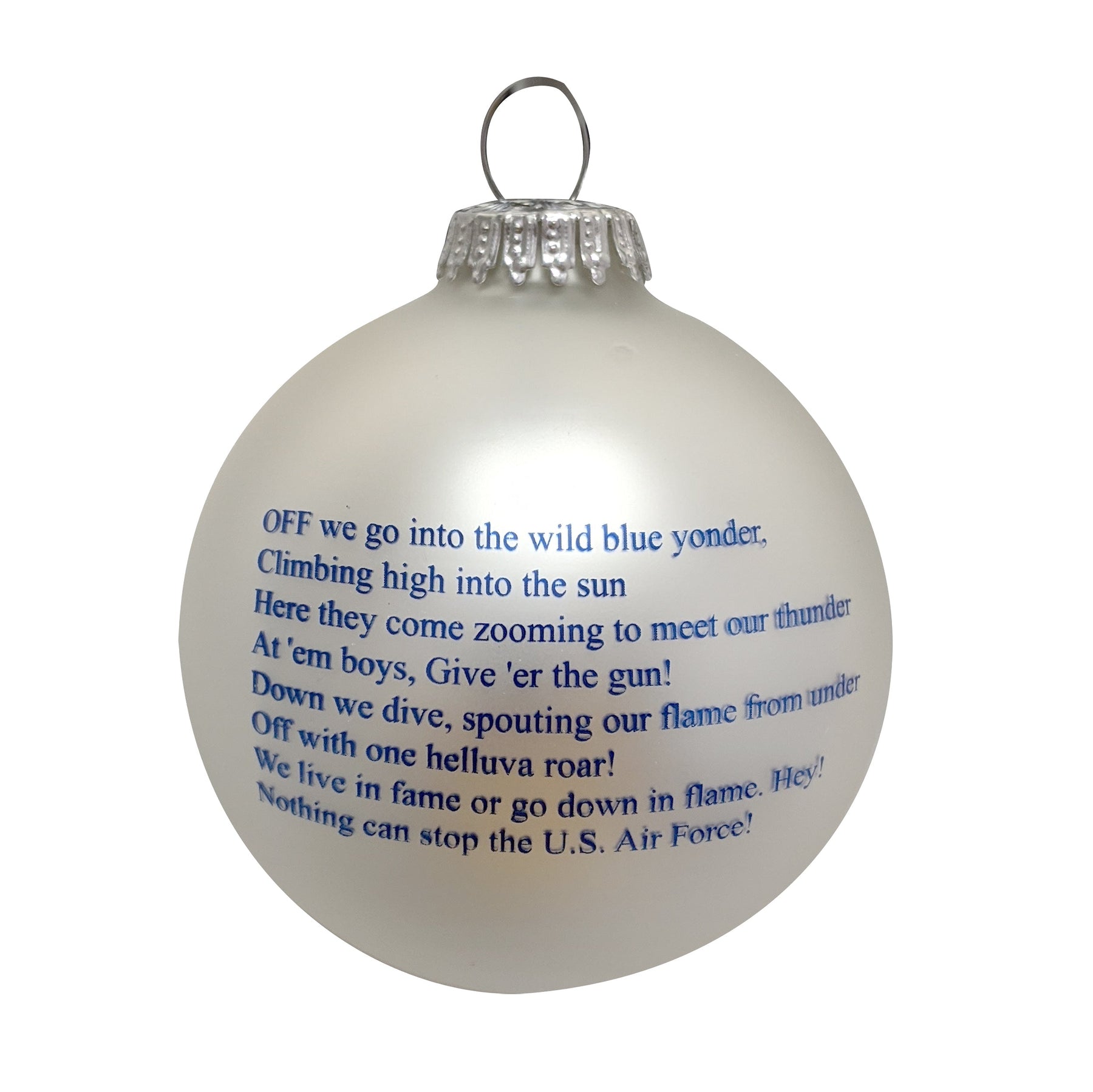 Silk Braided Silver Pearl 3 1/4" Glass Ball with US Air Force Logo and Hymn. 1 Piece??per Box. 12 Boxes per Case. Made in USA.
