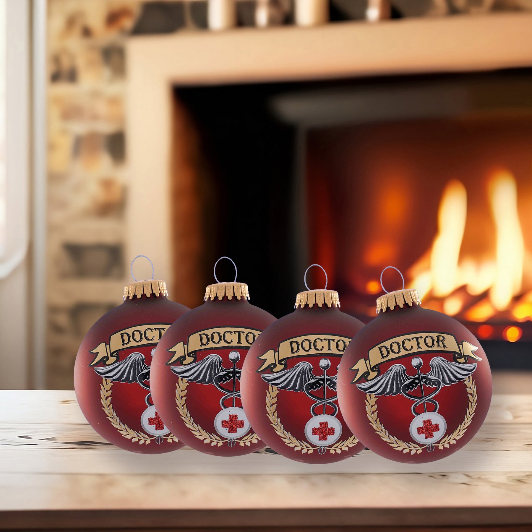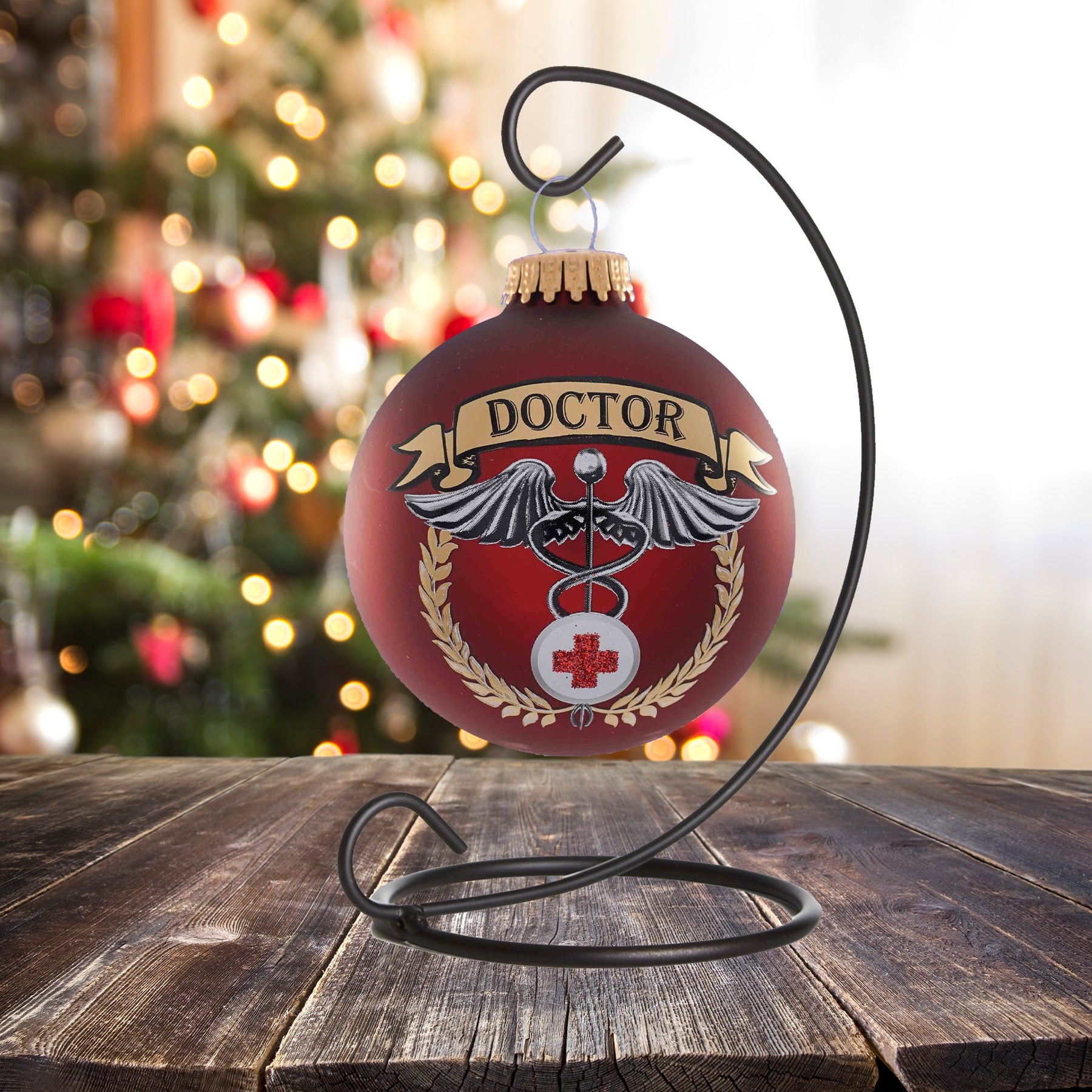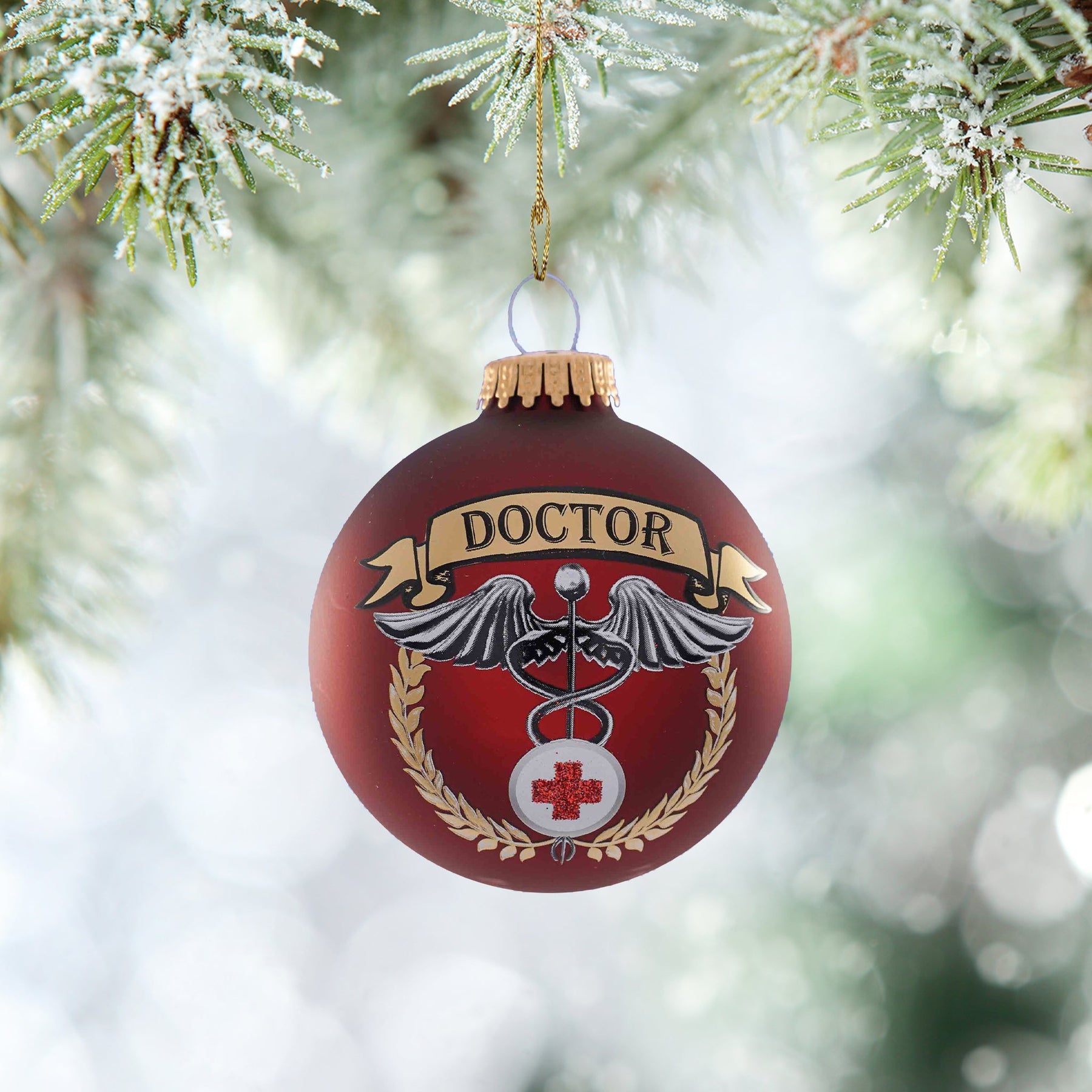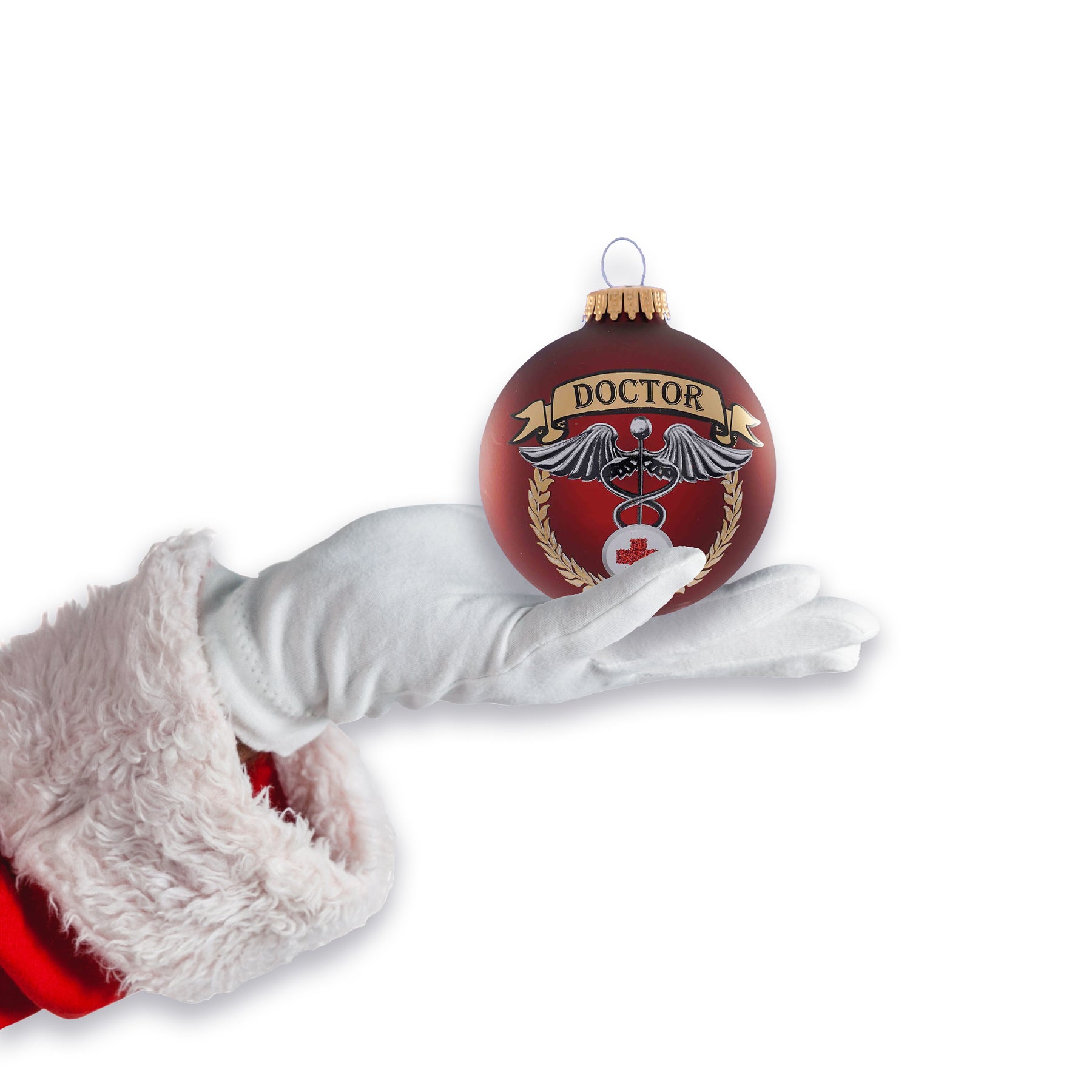 3 1/4" (80mm) Port Velvet Glass Ball with First Responders Doctor Icon. 1 Piece per Box. 12 Boxes per Case. Made in USA. Space on back and front of the ornament for Personalization.