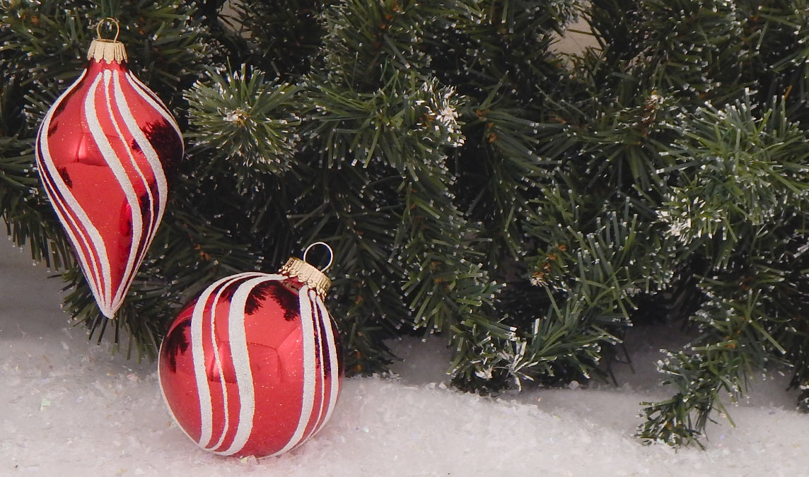 Candy Apple Red Glass 2 5/8" Balls / 4" Drop Shapes with White Swirls Assortment. 2 Styles per Assortment. 4 Pieces per box. 12 Boxes per Case. Made in Mexico